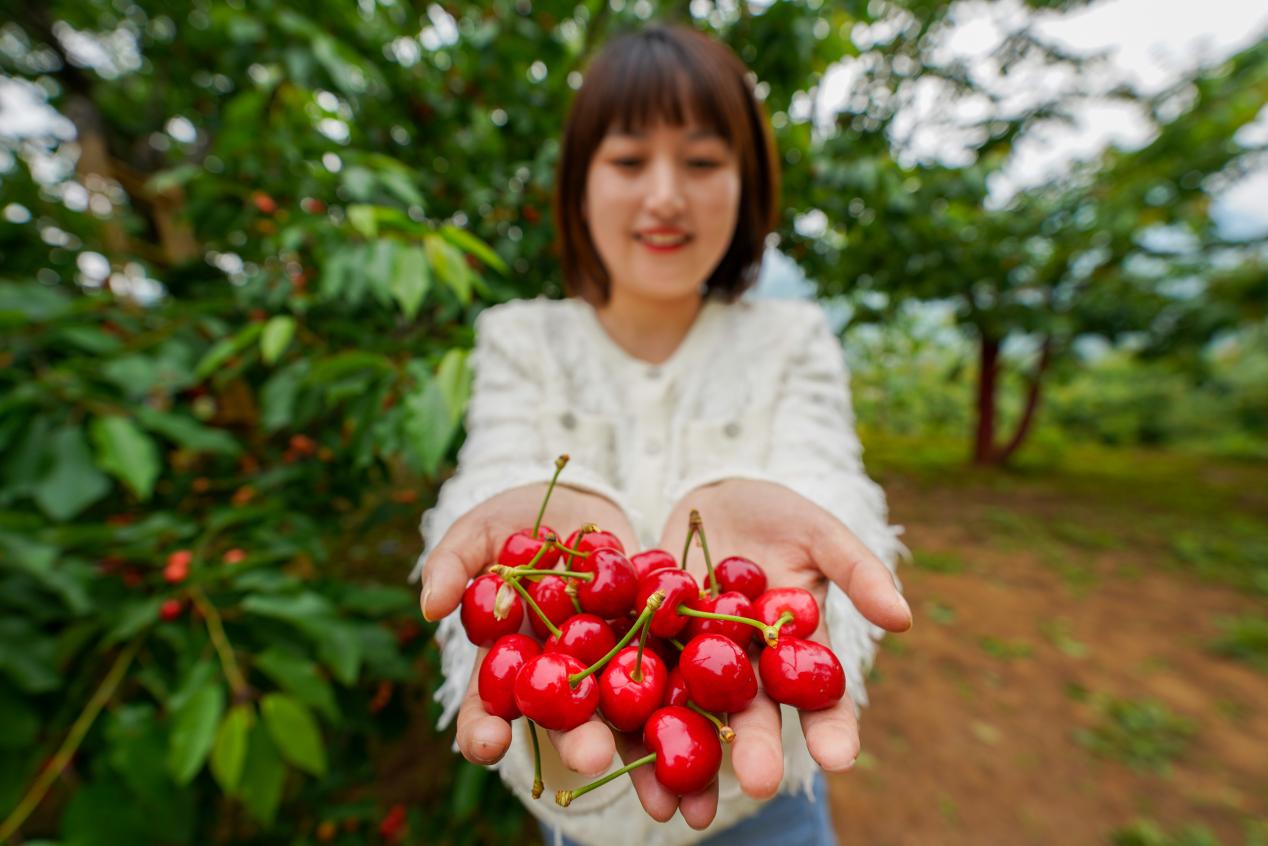 游客在成县西狭村樱桃园展示刚刚采摘的大樱桃。