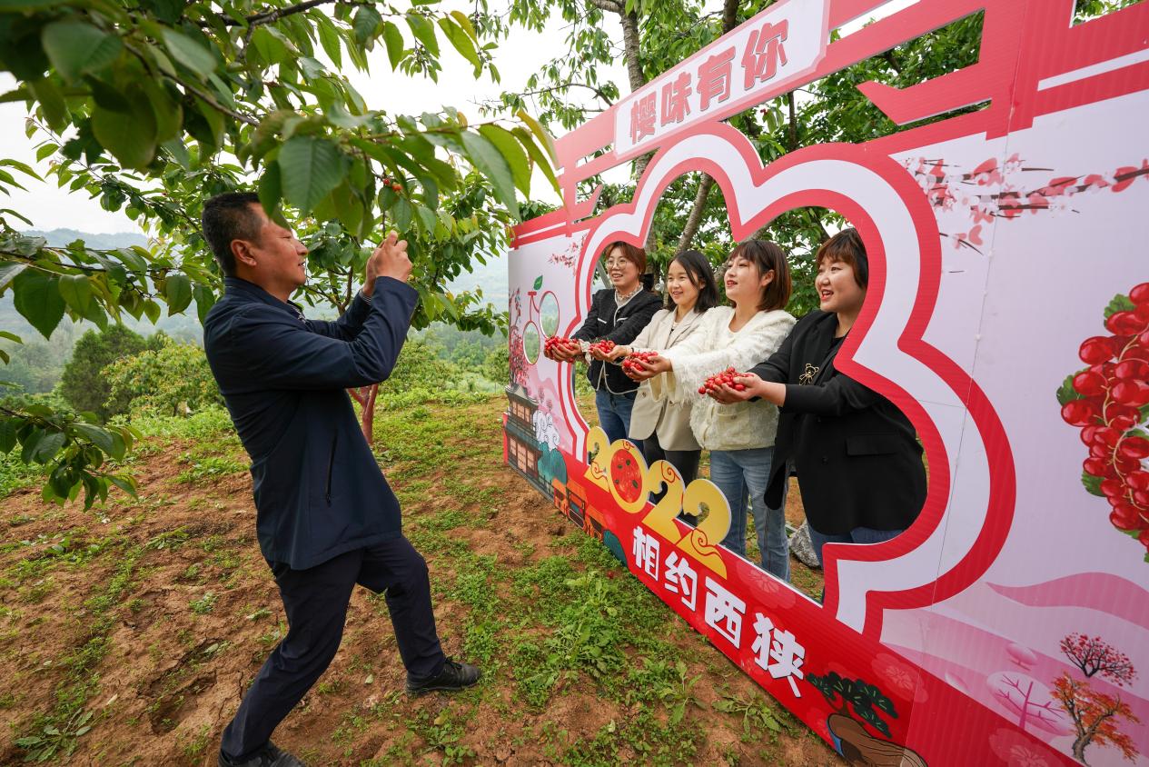 游客在成县在小川镇西狭村樱桃园体验采摘乐趣。