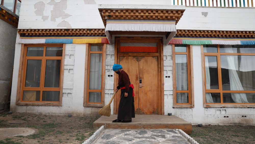 俄合拉村村民旦知草在自家的民宿前打扫卫生。新华社记者任延昕摄