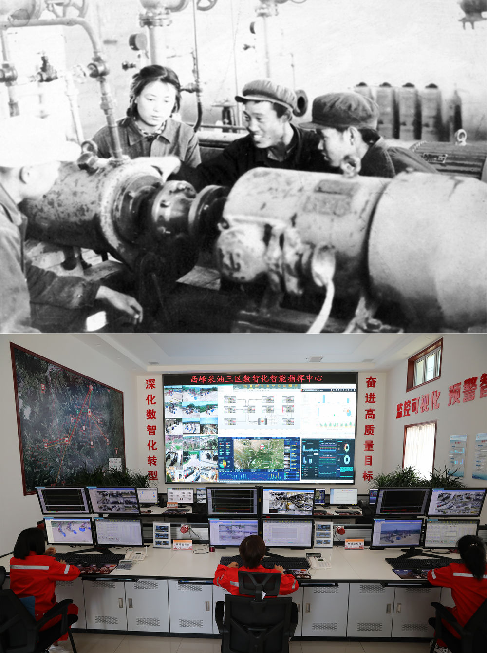 拼版照片:上图为1978年长庆油田采油二厂职工在作业现场操作设备(资料图片,长庆油田采油二厂供图);下图为2022年5月24日拍摄的长庆油田采油二厂职工在西峰采油三区数智化智能指挥中心实时监控生产运行情况(新华社记者杜哲宇摄)。