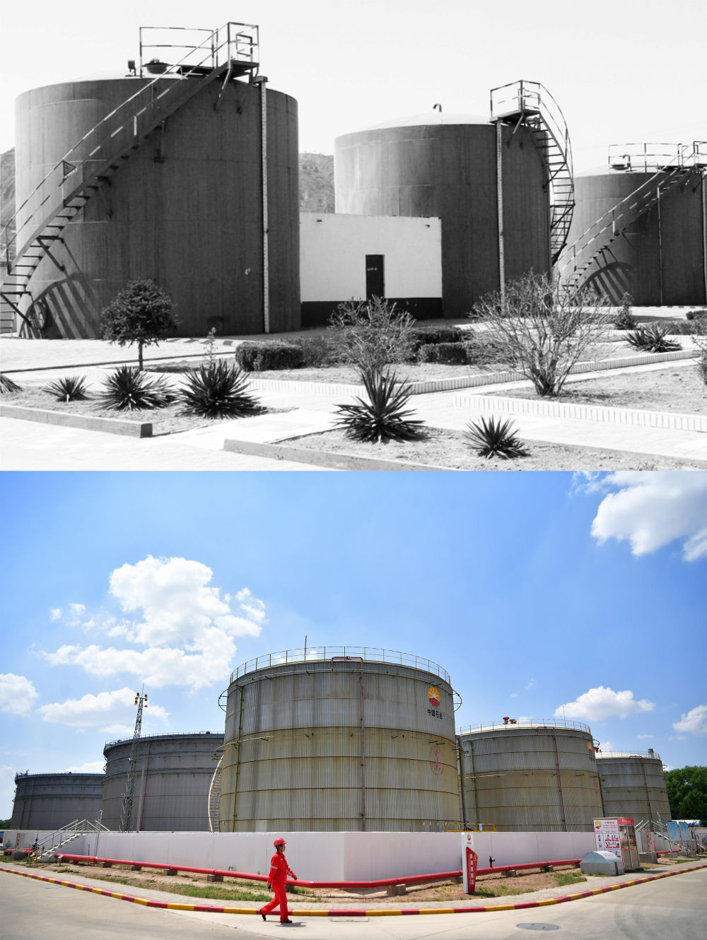 拼版照片:上图为1979年长庆油田采油二厂的一座原油集中处理站的储罐区(资料图片,长庆油田采油二厂供图);下图为2022年5月24日,长庆油田采油二厂一名职工从原油集中处理站的储罐区走过(新华社记者陈斌摄)。