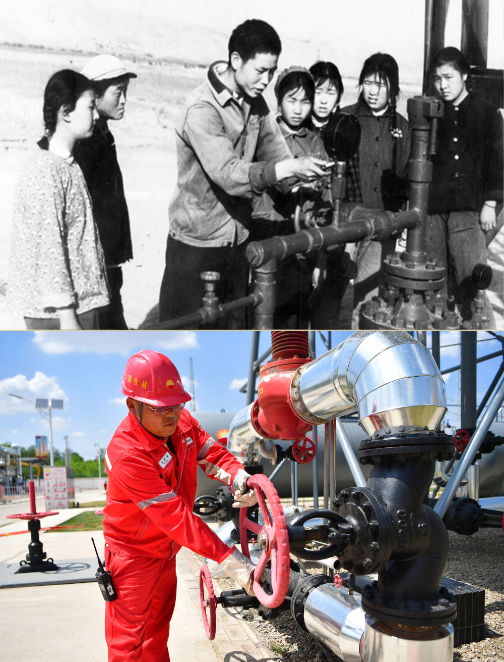 拼版照片:上图为1978年长庆油田采油二厂职工在作业现场通过“传帮带”学习设备操作技能(资料图片,长庆油田采油二厂供图);下图为2022年5月24日,长庆油田采油二厂职工徐志佳在生产现场作业(新华社记者陈斌摄)。