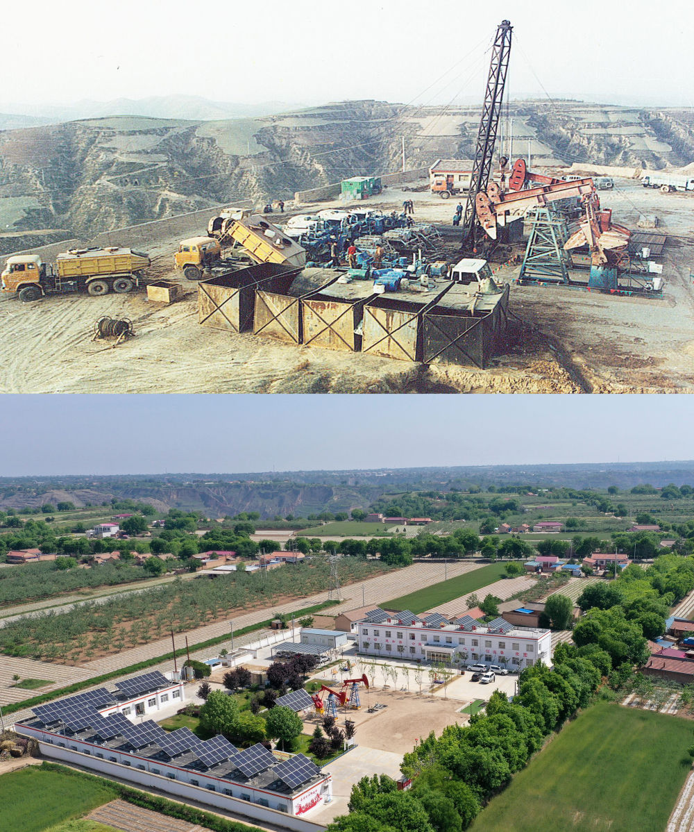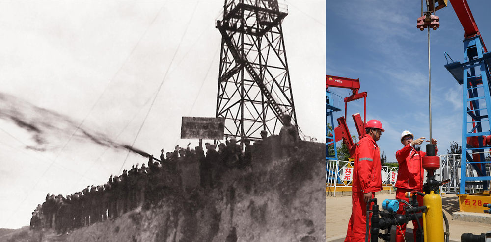 拼版照片:左图为1970年9月26日,长庆油田采油二厂“庆一井”获得工业油流,开启了长庆油田开发常规油气藏的时代(资料图片,长庆油田采油二厂供图);右图为2022年5月24日,长庆油田采油二厂西峰采油三区经理吴国才(右)和同事在采油井场的抽油机前查看设备运行情况(新华社记者杜哲宇摄)。