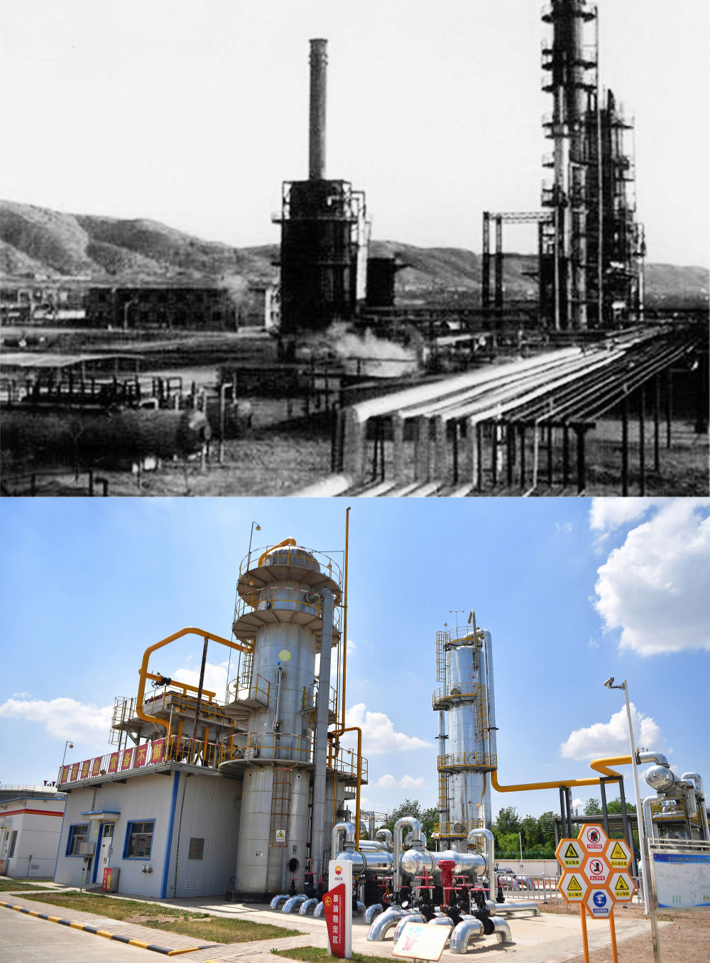 拼版照片:上图为1978年长庆油田马岭炼油厂的生产装置(资料图片,长庆油田采油二厂供图);下图为2022年5月24日拍摄的长庆油田采油二厂新一代的原油稳定装置(新华社记者陈斌摄)。