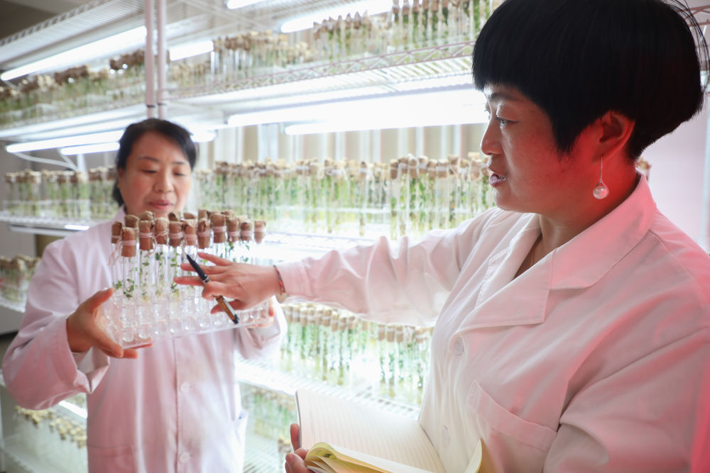 6月9日,在甘肃省定西市农业科学研究院,科研人员查看马铃薯种质资源库中种质脱毒苗生长情况。新华社记者马希平摄