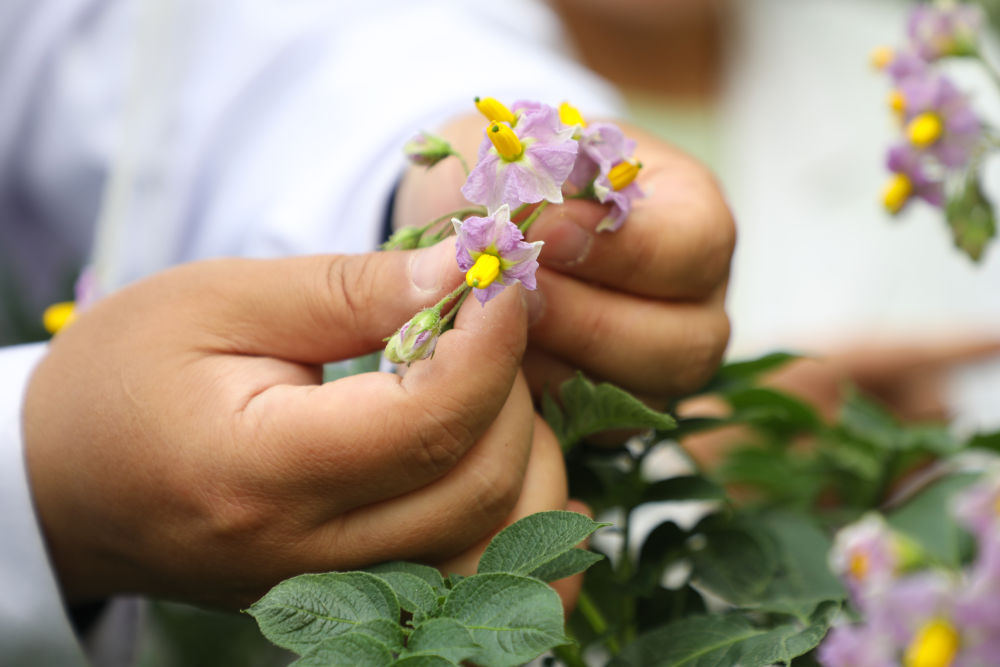 6月9日,甘肃省定西市农业科学研究院的科研人员查看马铃薯开花散粉情况。新华社记者马希平摄