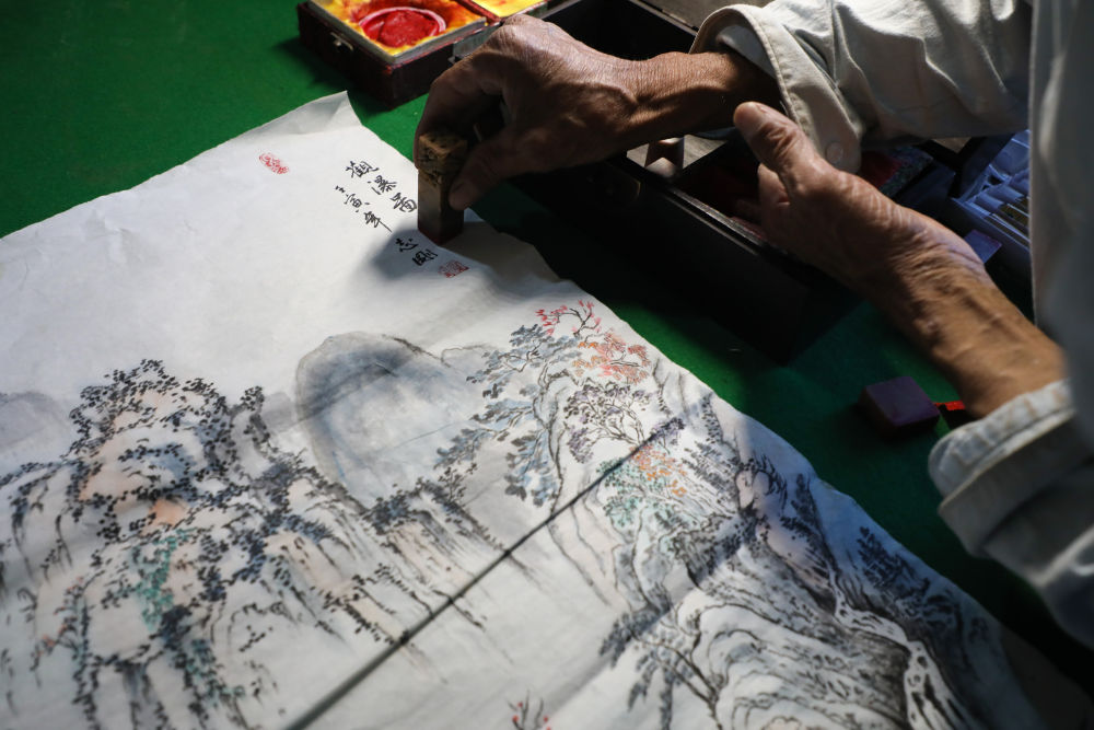 6月15日,在甘肃省定西市通渭县榜罗镇张川村许堡社,许志刚在家中给画好的国画盖章。(新华社记者马希平摄)