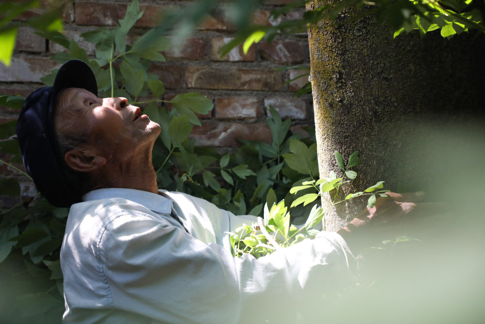 6月15日,在甘肃省定西市通渭县榜罗镇张川村许堡社,许志刚查看1968年自己种的第一棵树的生长情况。(新华社记者马希平摄)
