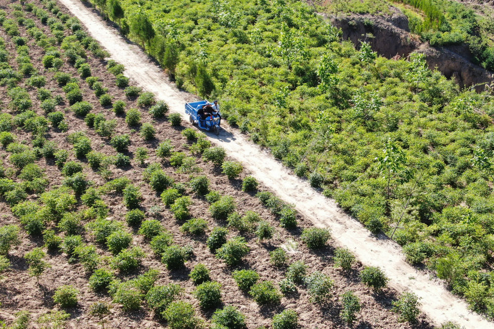 6月15日,在甘肃省定西市通渭县榜罗镇张川村许堡社,“刚强兄弟”驾驶三轮车去看望树林生长情况(无人机照片)。(新华社记者马希平摄)