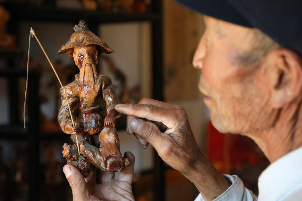 6月15日,在甘肃省定西市通渭县榜罗镇张川村许堡社,许志刚在家中摆放自己制作的根雕作品。(新华社记者马希平摄)