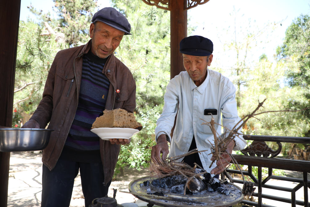 6月15日,在甘肃省定西市通渭县榜罗镇张川村许堡社,“刚强兄弟”许志刚(右)和许志强在自家花园里煮罐罐茶。(新华社记者马希平摄)