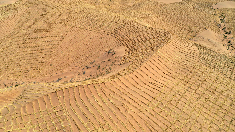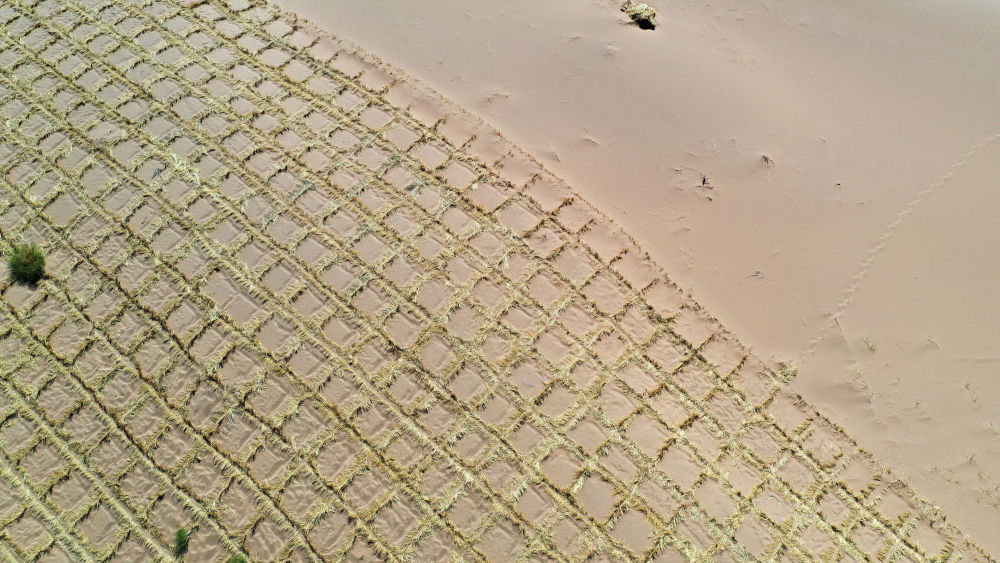 这是武威市凉州区邓马营湖治沙区域已经铺设完草方格沙障的沙漠(6月16日摄,无人机照片)。新华社记者陈斌摄