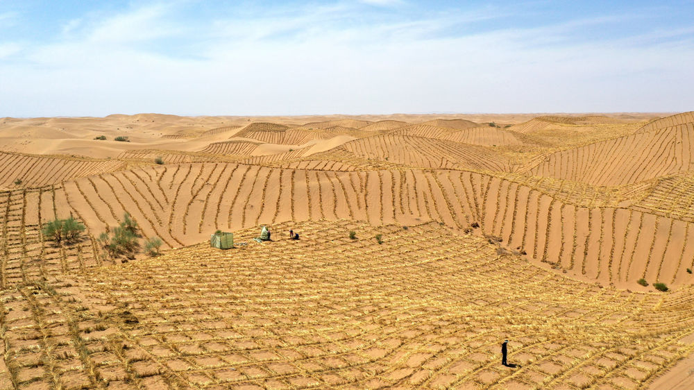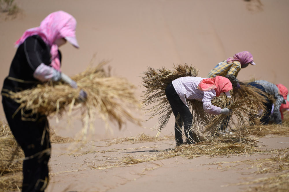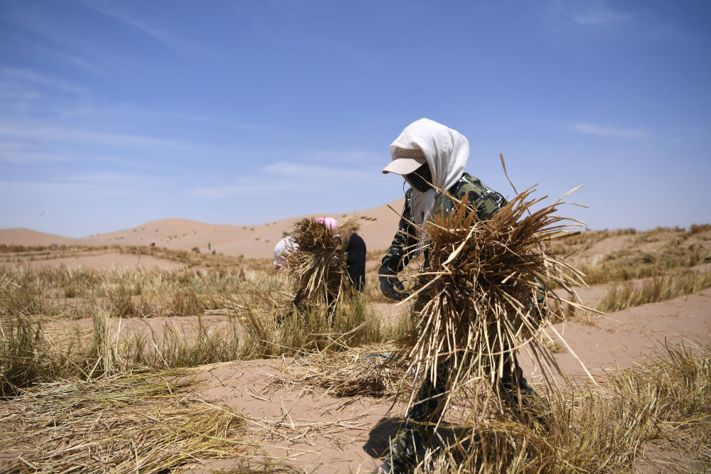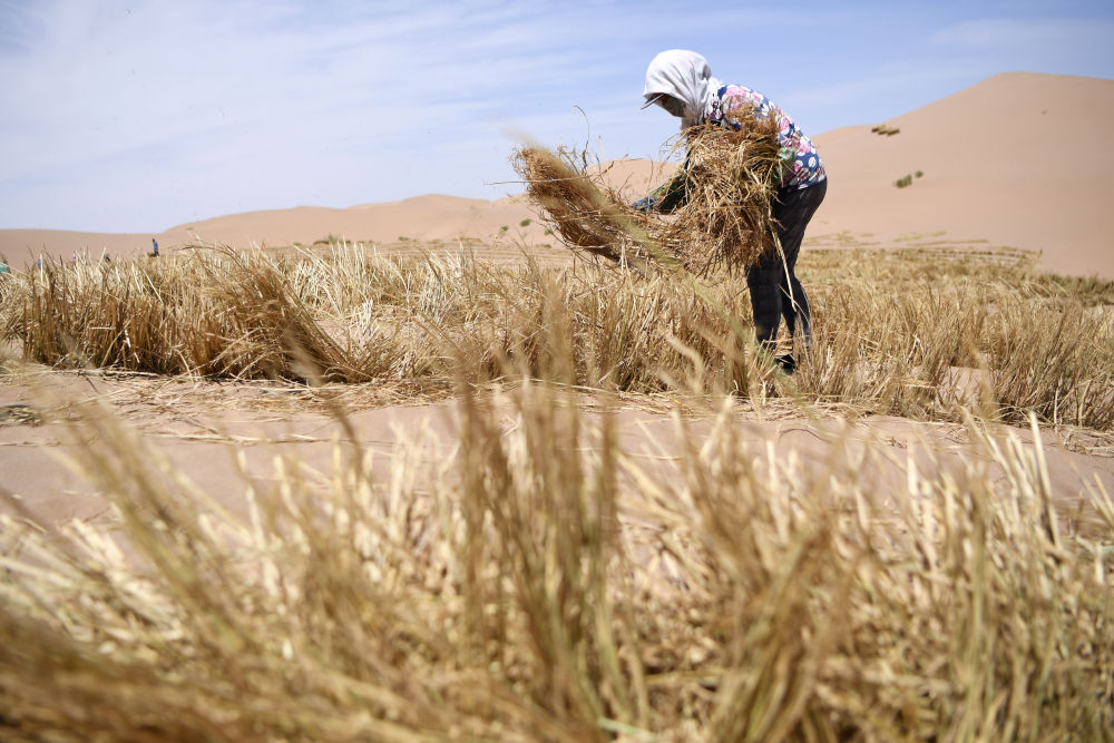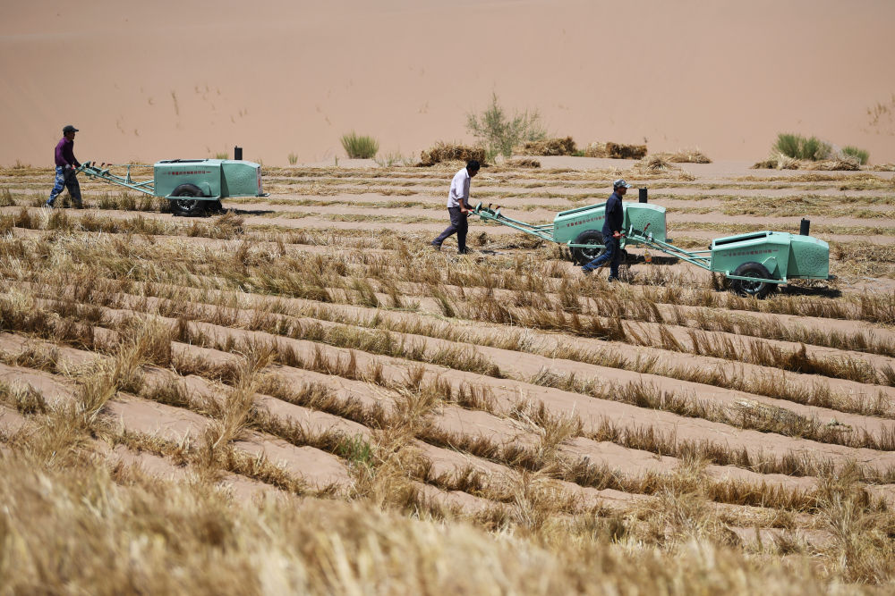 治沙工人在武威市凉州区邓马营湖治沙区域进行压沙作业(6月16日摄)。新华社记者陈斌摄