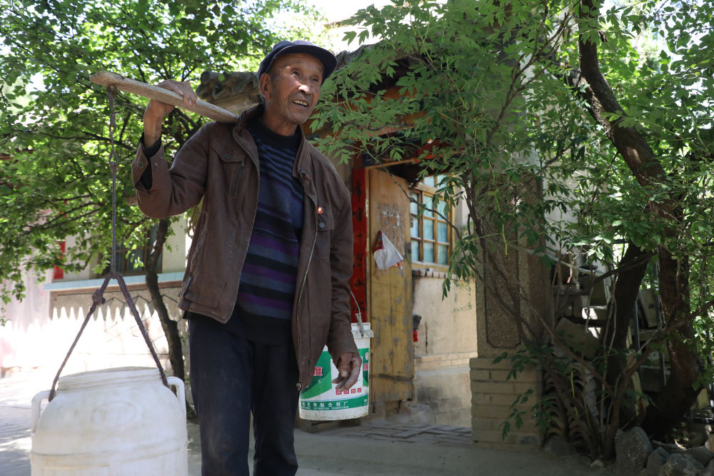 6月15日,甘肃省定西市通渭县榜罗镇张川村村民准备挑水浇树。新华社记者马希平摄