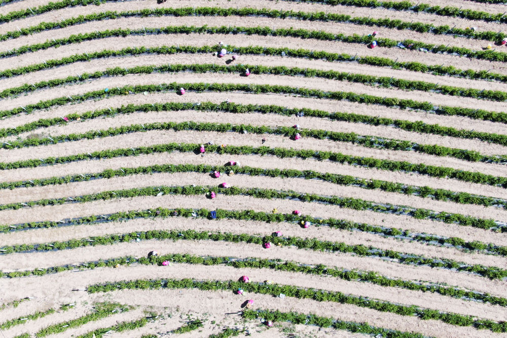 6月14日,务工人员在甘肃省定西市通渭县常家河镇山楂小镇农业观光旅游区的樱桃园采摘樱桃。新华社记者马希平摄