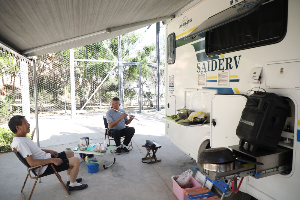 6月14日,游客在甘肃省定西市通渭县常家河镇山楂小镇农业观光旅游区休闲娱乐。新华社记者马希平摄