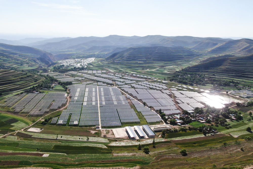 这是6月15日在甘肃省定西市通渭县榜罗镇四新村拍摄的集中式光伏电站(无人机照片)。新华社记者马希平摄