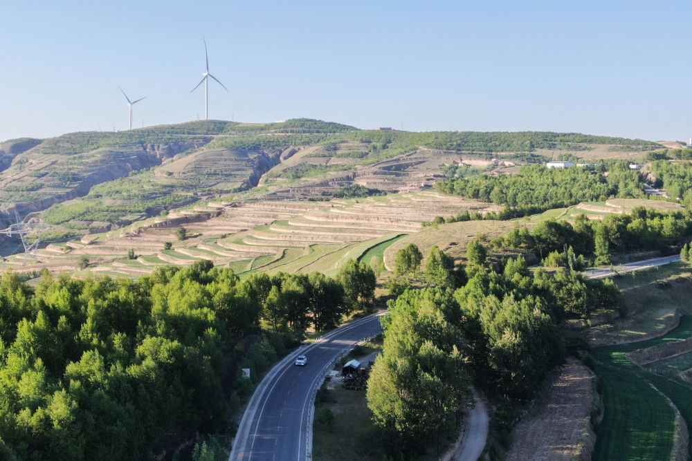 这是6月15日在甘肃省定西市通渭县马营镇拍摄的风力发电设施与山坡林地(无人机照片)。新华社记者马希平摄