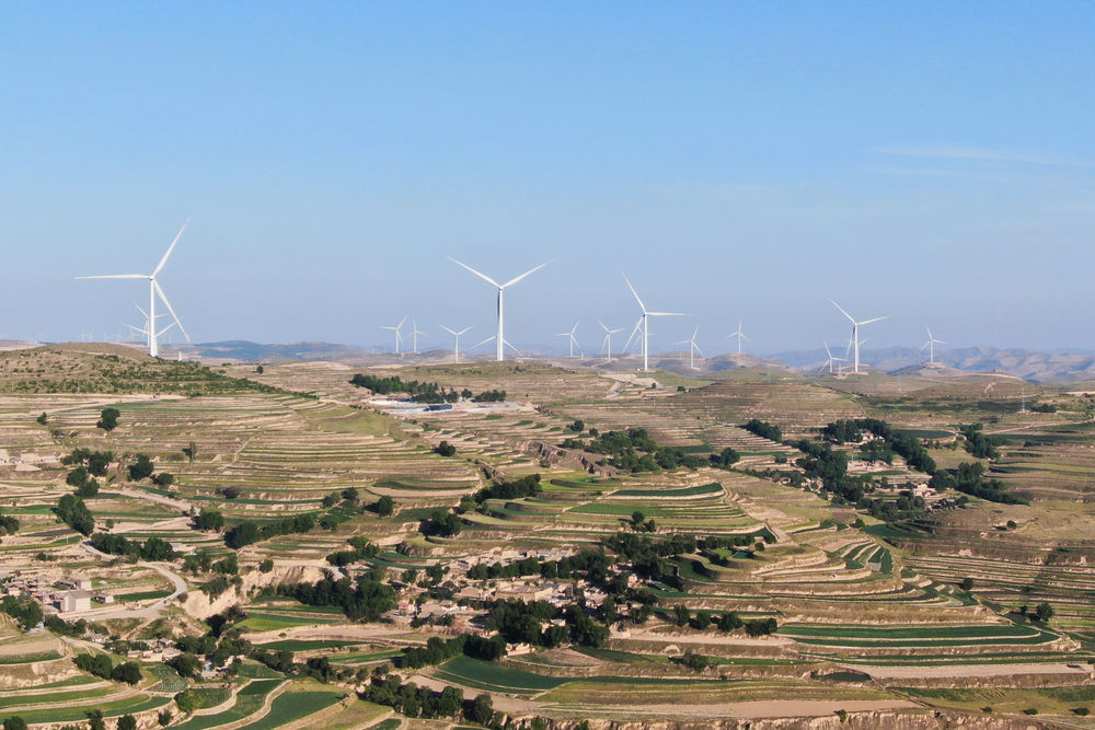 这是6月15日在甘肃省定西市通渭县马营镇拍摄的风力发电设施与梯田风光(无人机照片)。新华社记者马希平摄