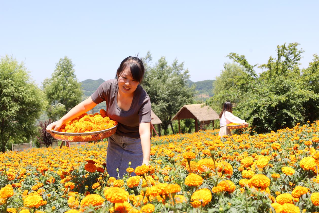 当下,正是成县2万余亩万寿菊的盛开季和采摘季,群众在收获完油菜、小麦后,又开始穿梭在花海间忙碌着采收花朵,用双手采摘着增收致富的希望,捡拾着尽情绽放的“金钱花”。