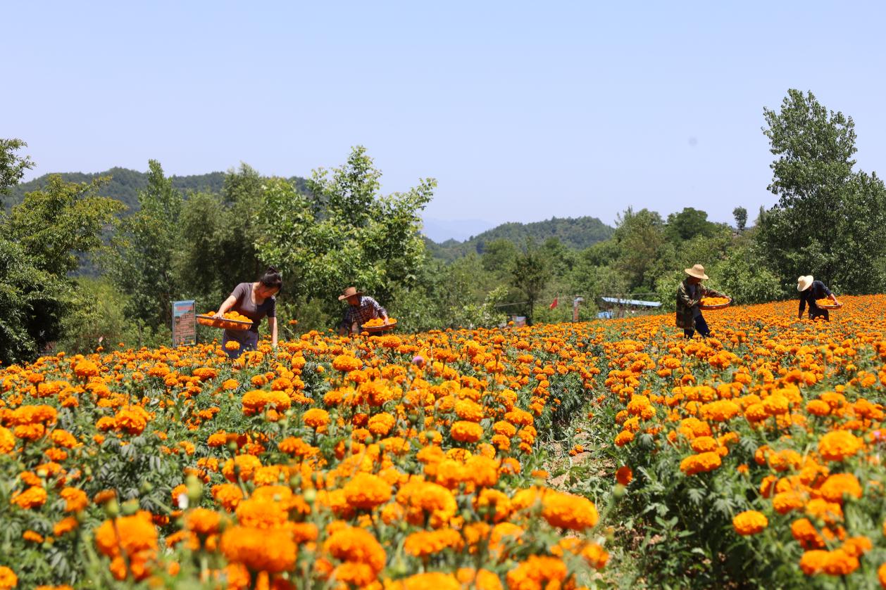 鸡峰镇坪庄村群众采摘盛开的万寿菊刘建军摄