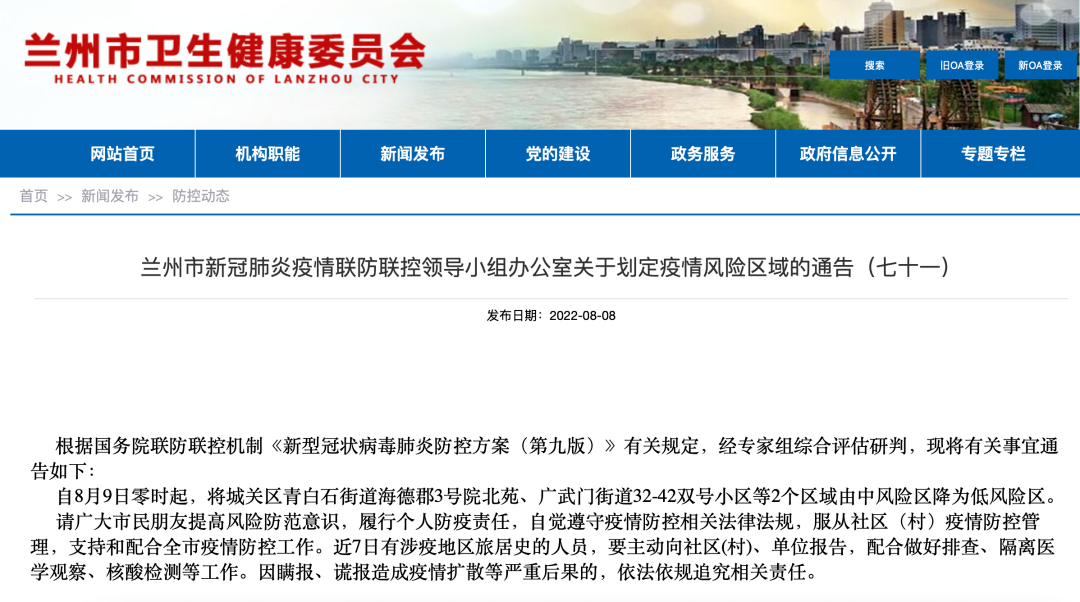 兰州市新冠肺炎疫情联防联控领导小组办公室关于划定疫情风险区域的通告(七十一)