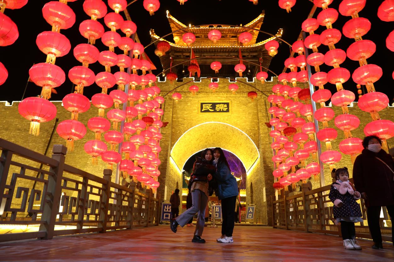 游客在民乐古城合影留念