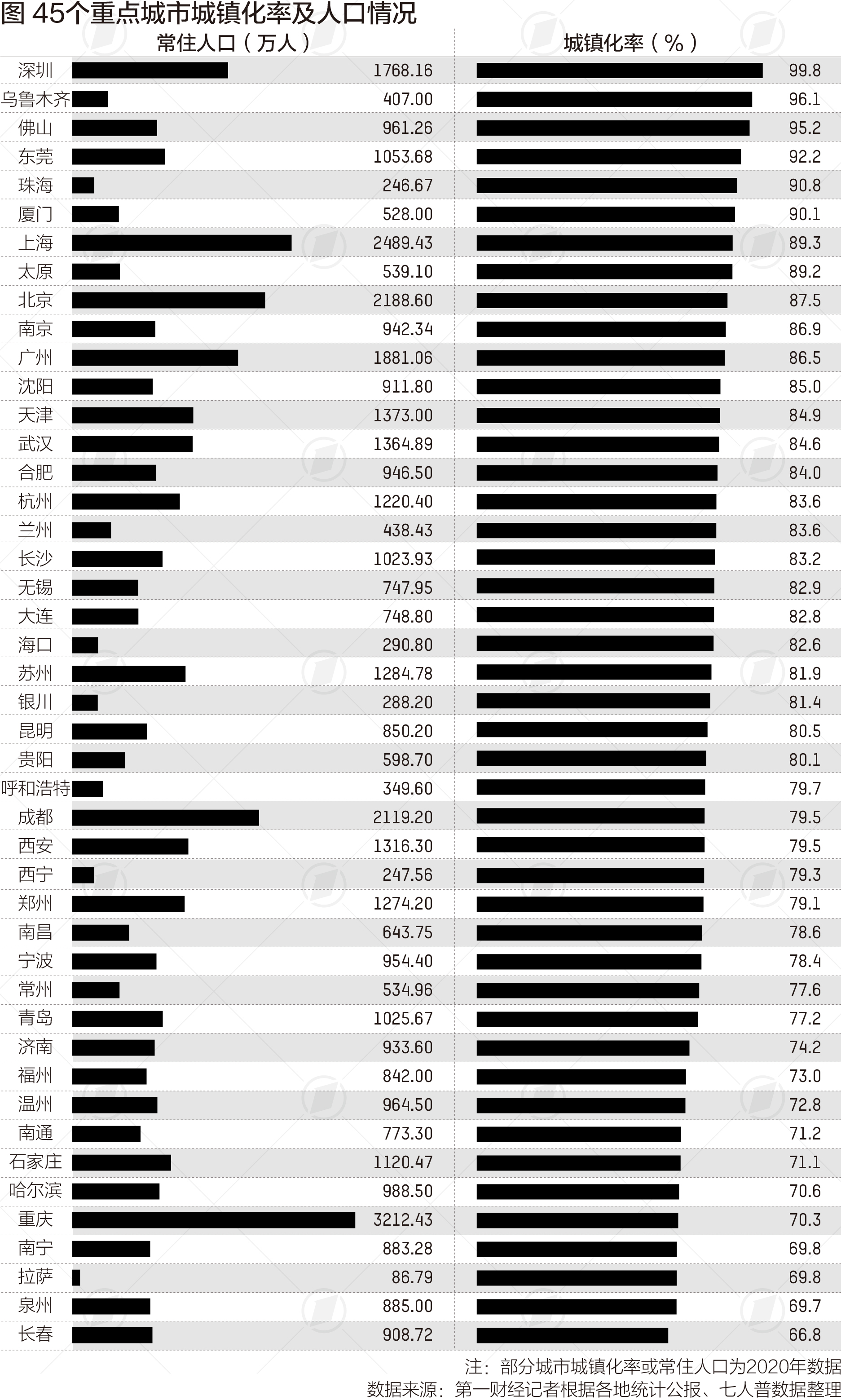 据国家统计局的数据显示,2021年我国城镇常住人口为91425万人,城镇化率为64.7%。近日,第一财经对45个城市城镇化率梳理发现,城镇化率普遍高于全国平均水平,其中有25个城市超过80%,有6个城市城镇化率超过90%,深圳以99.8%居第一,兰州83.6%,和杭州并列16位,远高于全国城平均城镇化率,这有点出人意料。