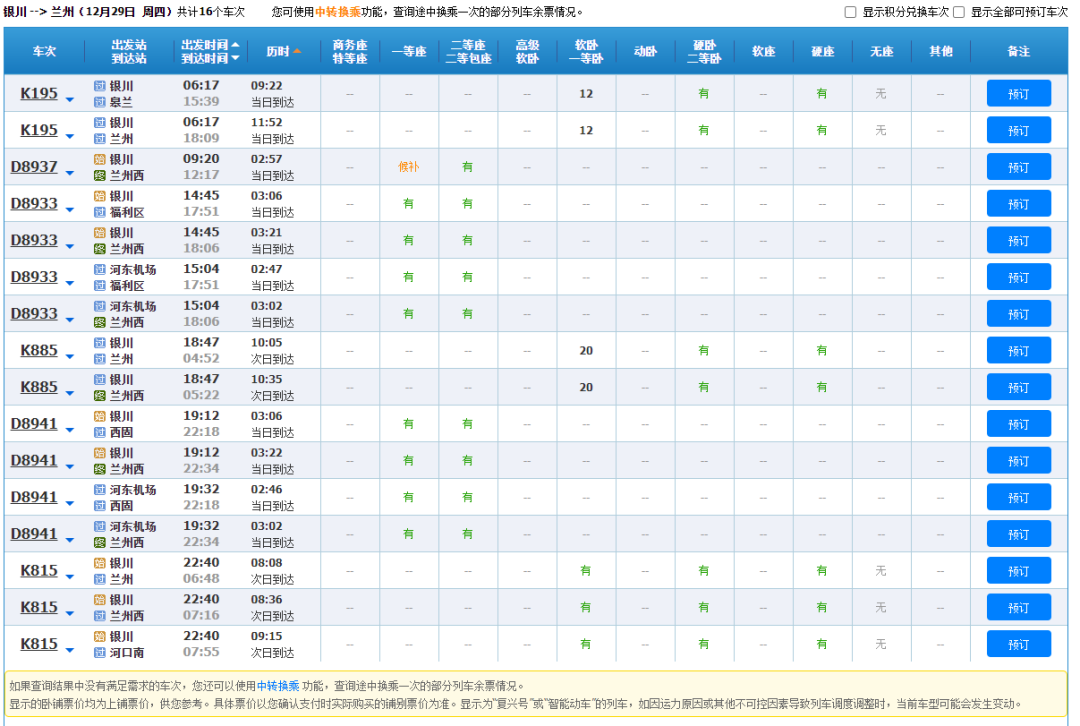 银川—兰州西的D8941次,12月29日19:12由银川站始发,当日22:34终到兰州西站,历时3小时22分钟,一、二等座票价分别为:239元、150元。
