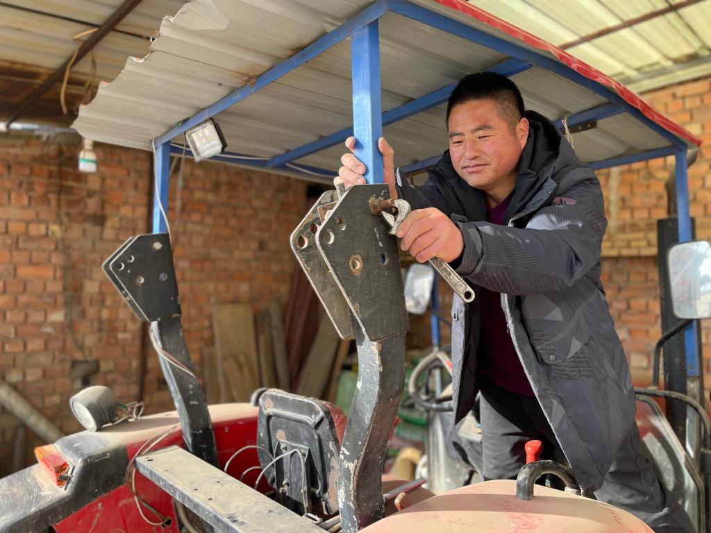 尹想成在检修挖药机。(新华社记者郭刚摄)