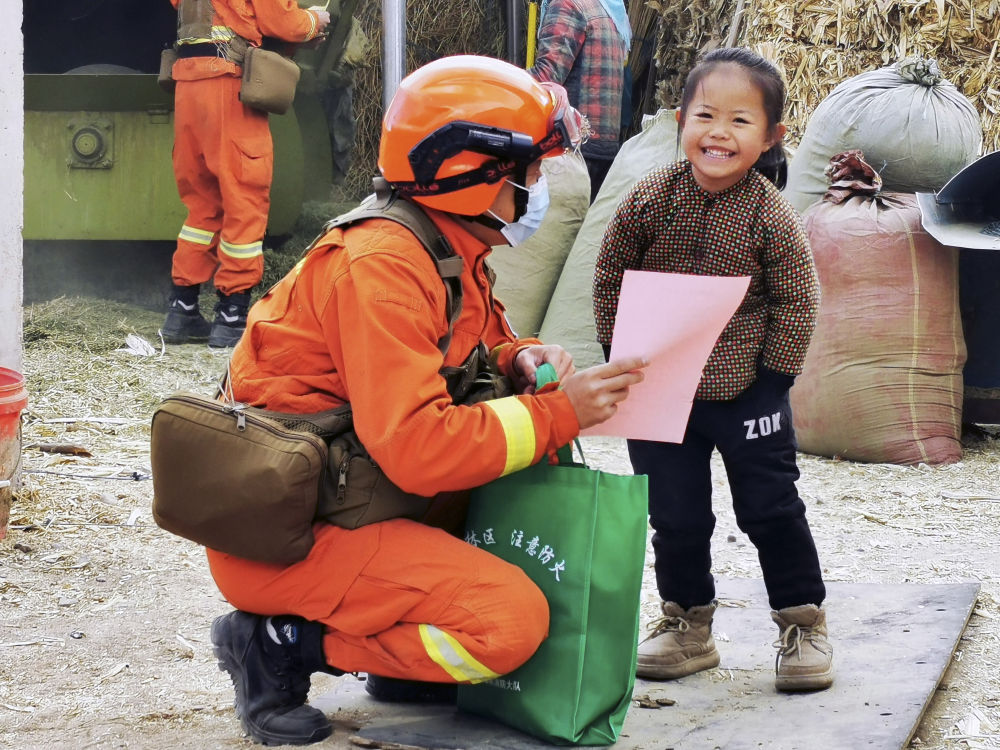 1月11日,森林消防员在肃南裕固族自治县西柳沟村向小朋友讲解消防知识。新华社记者张新新摄