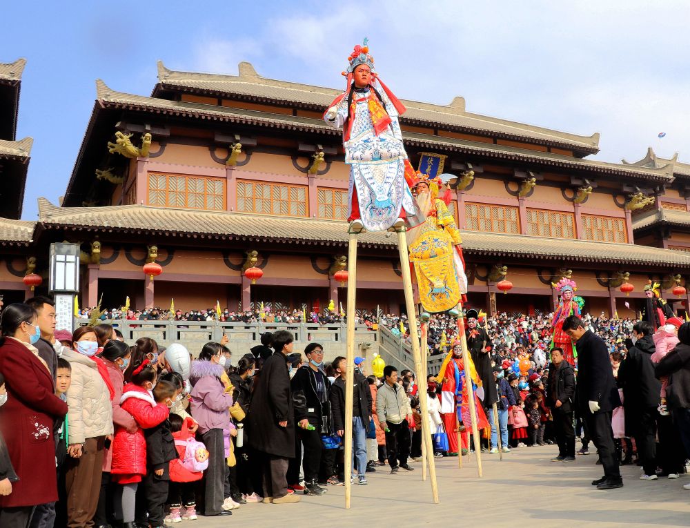 2月5日,在甘肃省平凉市静宁县成纪文化城广场,人们在观看踩高跷表演。新华社发(王毅摄)