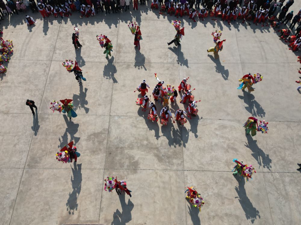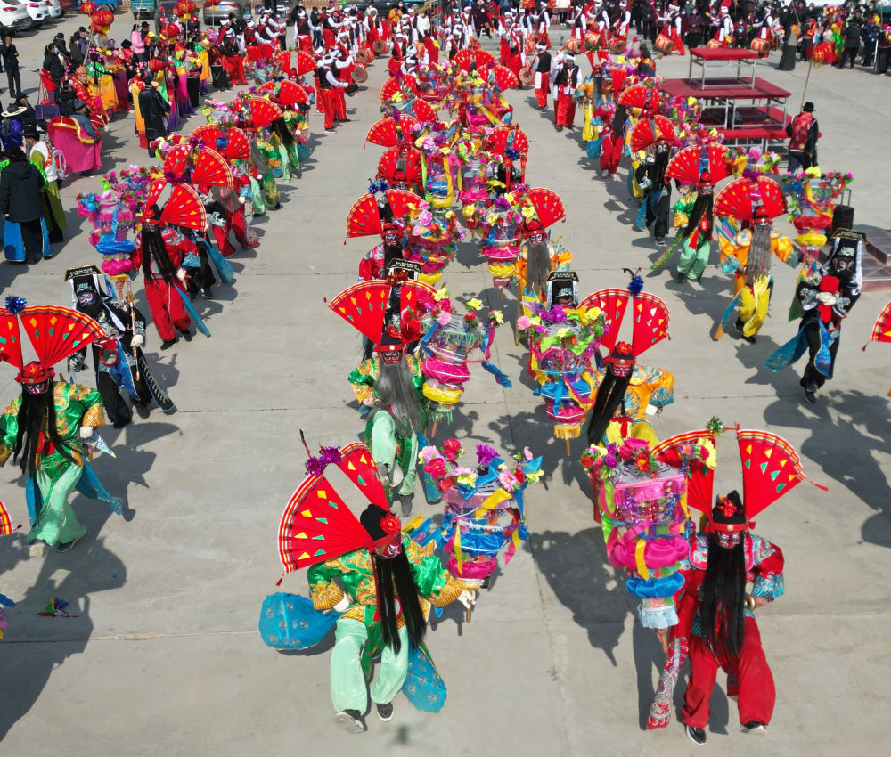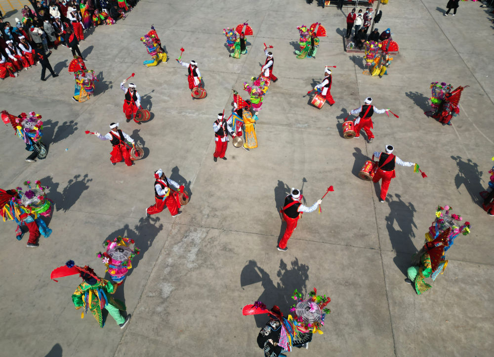 2月5日,在甘肃省永靖县刘家峡镇城北新村,乡村秧歌队在表演民俗节目“太平鼓舞”。新华社发(史有东摄)
