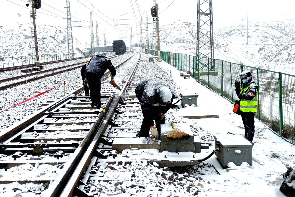 2月13日,中国铁路兰州局集团有限公司嘉峪关电务段工作人员对信号和道岔设备进行除雪作业。新华社发(陈腾摄)