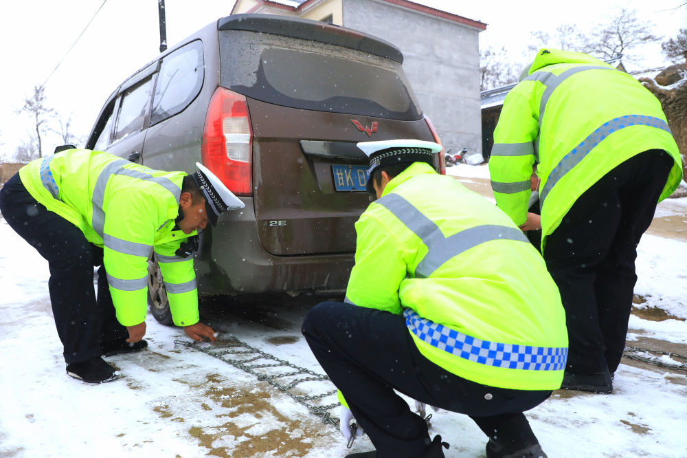 2月13日,甘肃省陇南市礼县交警帮助车辆安装防滑链。新华社发(杨含龙摄)