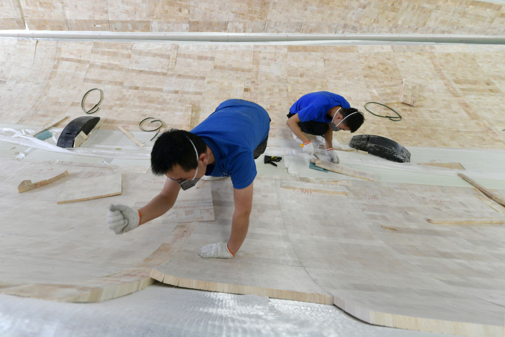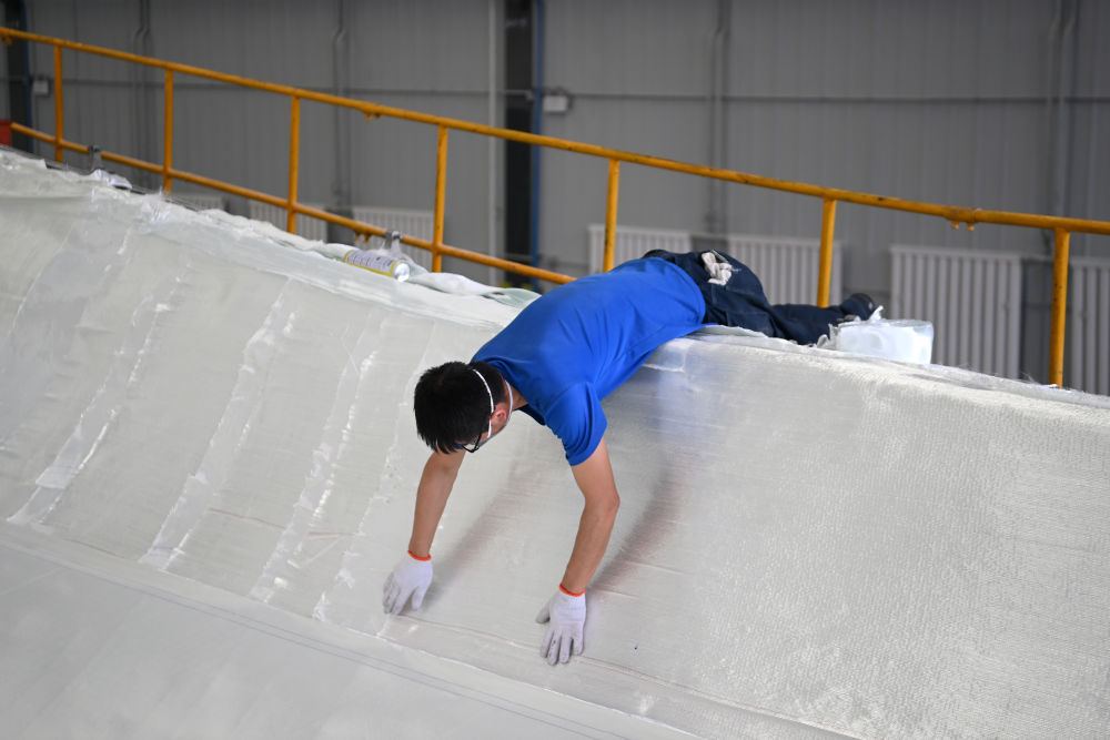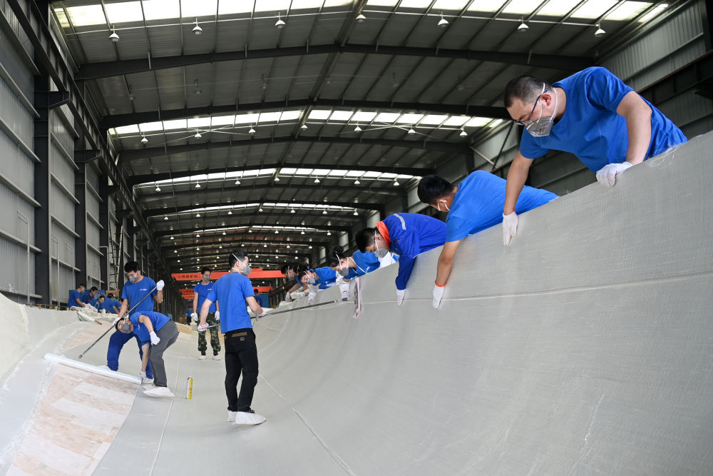 2月17日,在酒泉经济技术开发区的一家风电叶片制造企业,工人在风机叶片生产线为叶片灌注做准备。新华社记者范培珅摄