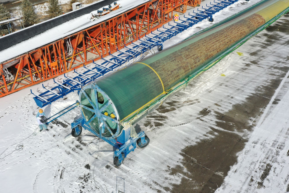 2月17日,在酒泉经济技术开发区的一家风电叶片制造企业,工人在运输风机叶片。新华社记者范培珅摄