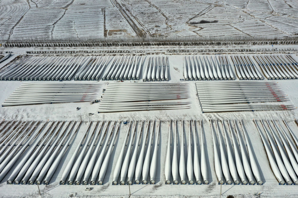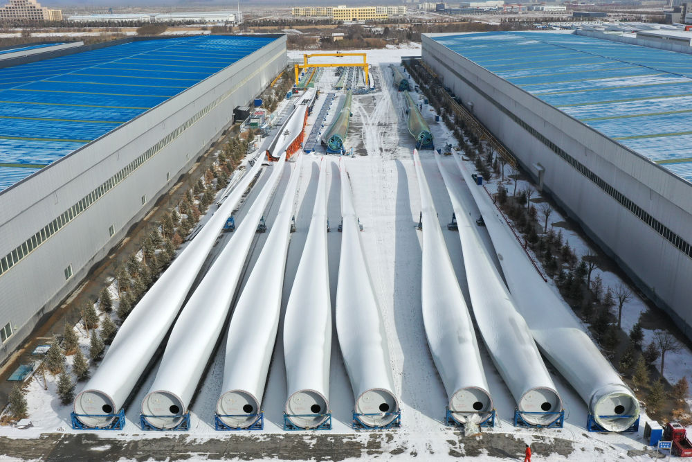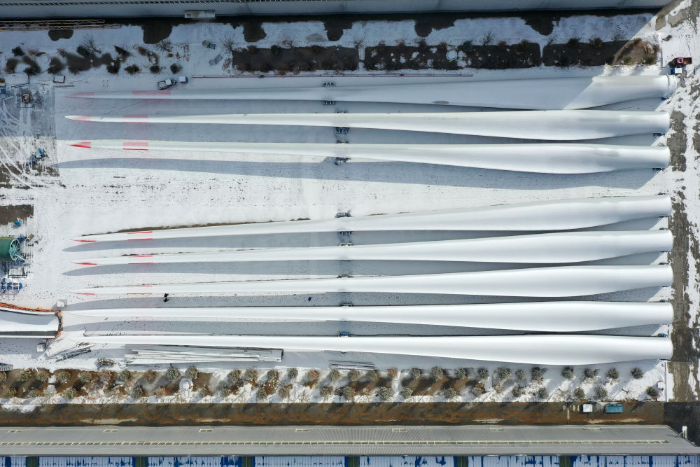 这是2月18日在武威市凉州区一家风电装备生产企业拍摄的风机叶片成品(无人机照片)。新华社记者范培珅摄