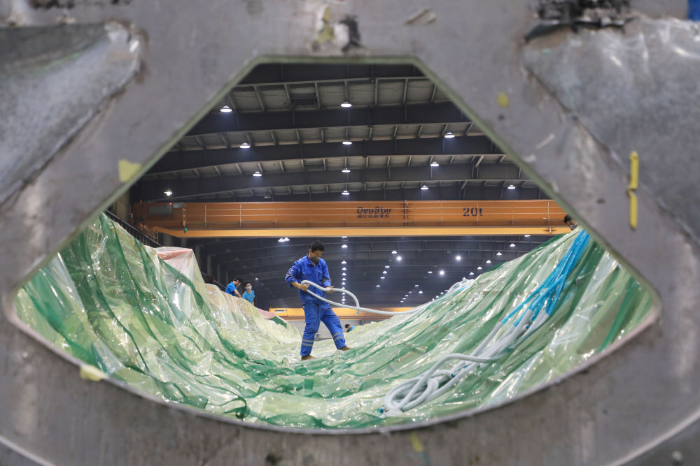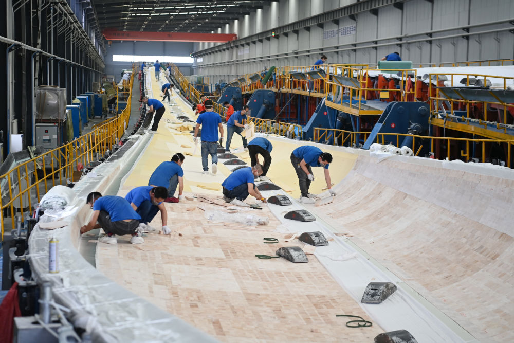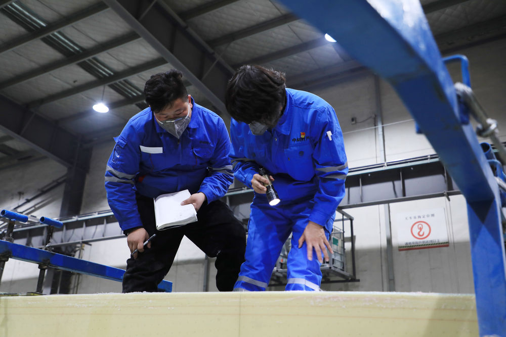 2月17日,在酒泉经济技术开发区的一家风电叶片制造企业,工人在风机叶片生产线检查生产情况。新华社记者范培珅摄