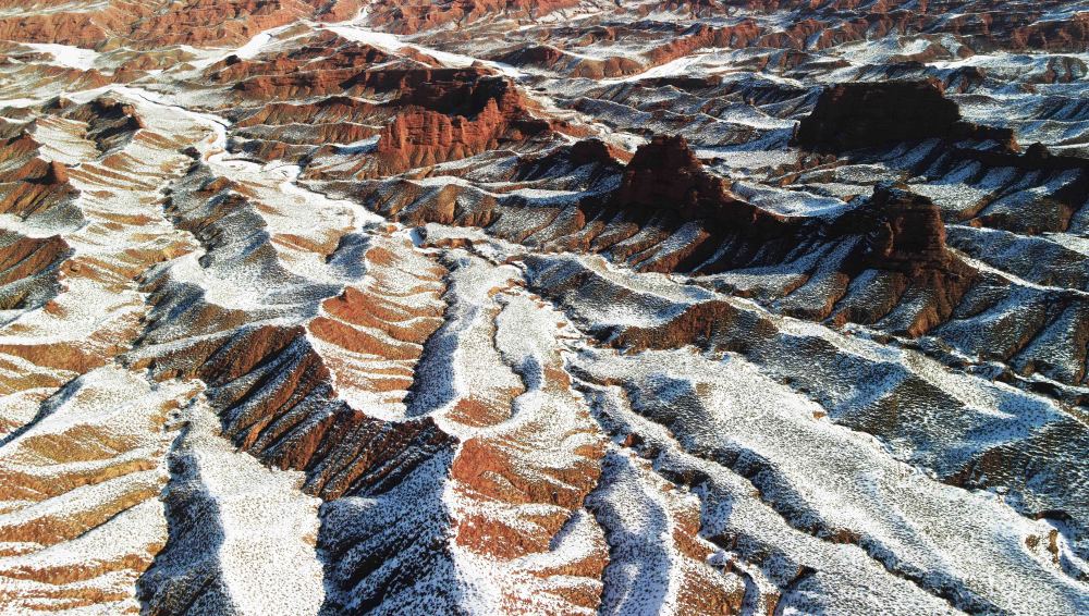 近日,甘肃省张掖市甘州区连续降雪,雪后的平山湖大峡谷在白雪的映衬下更显壮美。