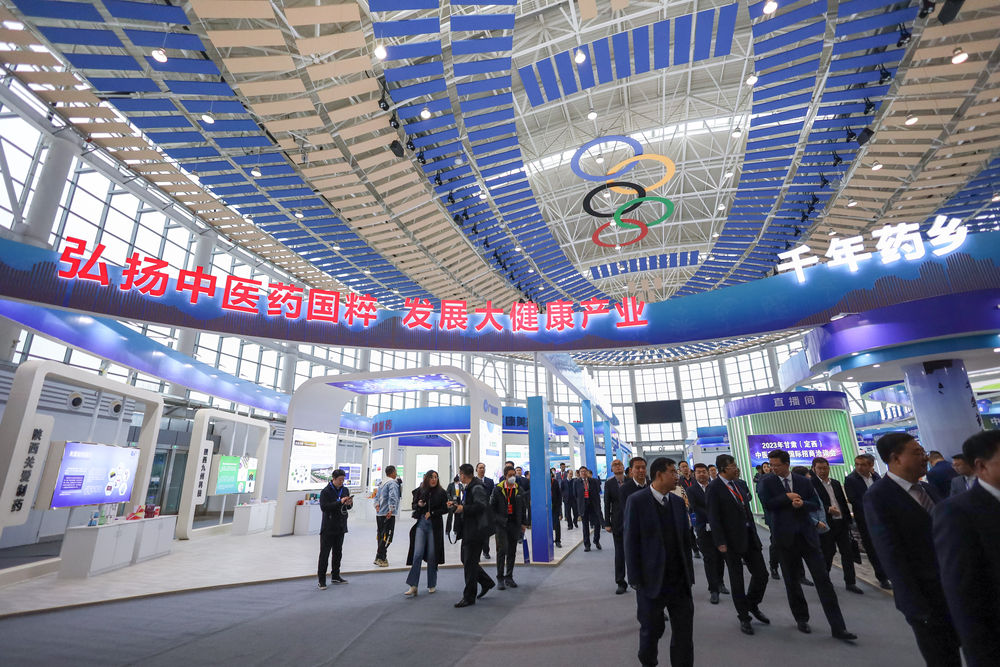 3月21日,与会嘉宾在2023年甘肃(定西)中医药产业国际招商洽谈会参观。新华社记者马希平摄