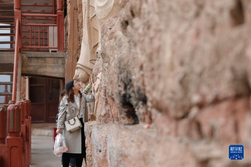 4月1日,游客在麦积山石窟参观。新华社记者方欣摄