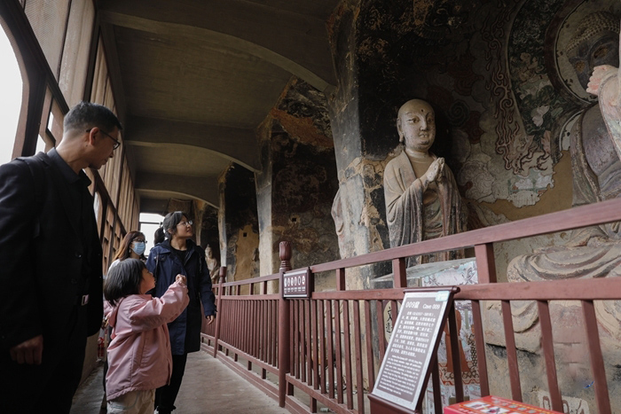 4月1日,游客在麦积山石窟参观。新华社记者方欣摄