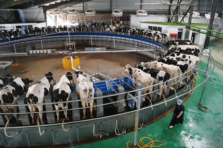 在武威市古浪县生态奶牛产业园的一家企业牧场,工作人员在转盘式挤奶机旁工作。新华社记者范培珅摄