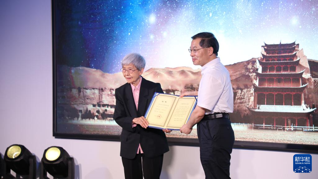 7月10日,樊锦诗(左)领取“樊锦诗星”命名证书。新华社记者张睿摄