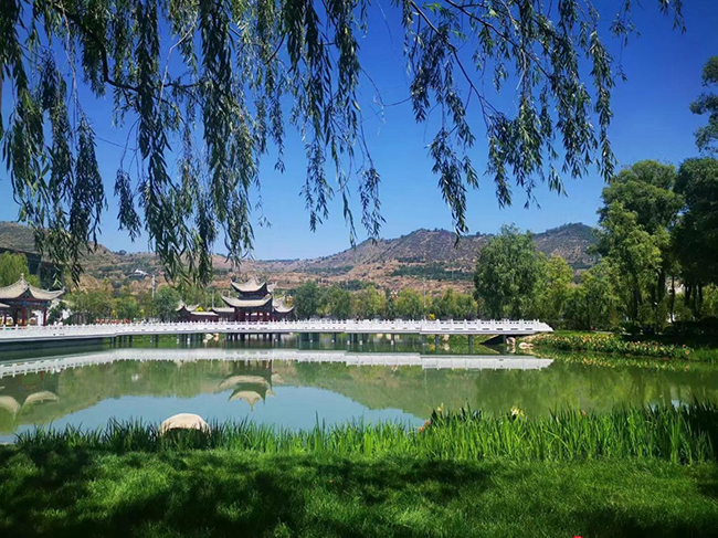 仿若山河画卷,堪称陇上江南。亭台水榭倚桥涵,满目葳蕤潋滟。 民族交融纽带,齐家文化摇篮。寻根溯祖意犹酣,大夏风情尽览。