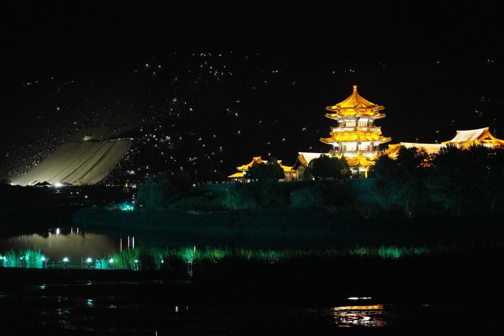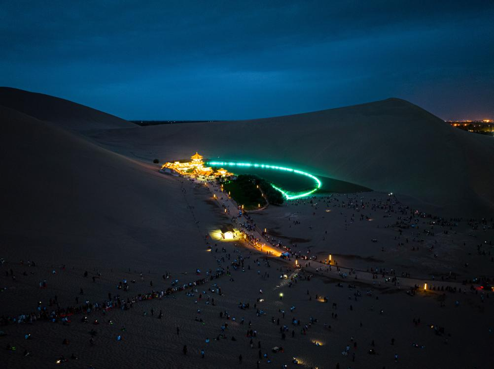 8月8日夜,游客在敦煌鸣沙山月牙泉景区游览(无人机照片)。新华社记者 张可任 摄