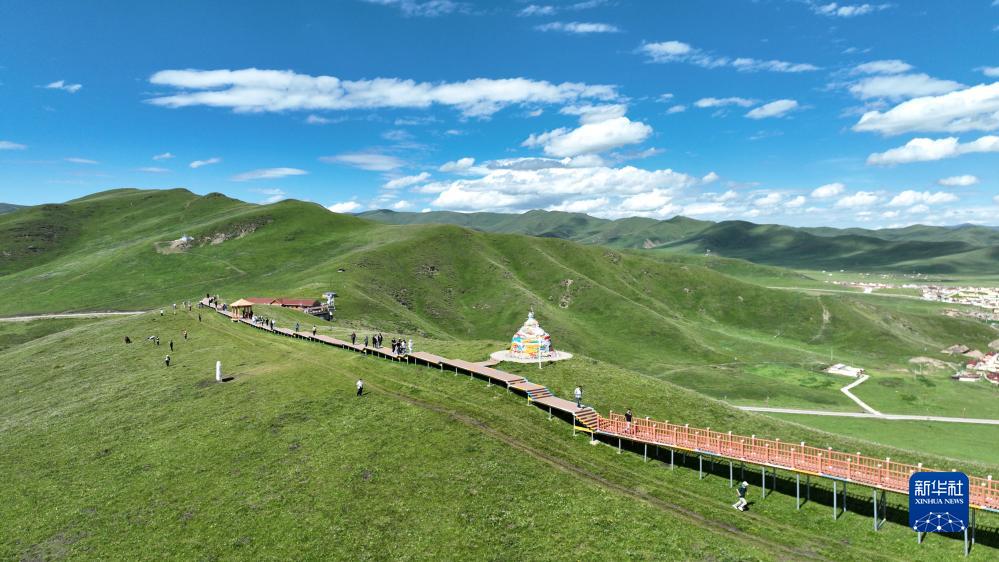 游客在甘南藏族自治州玛曲县阿万仓湿地的观景步道上游览(7月6日摄,无人机照片)。