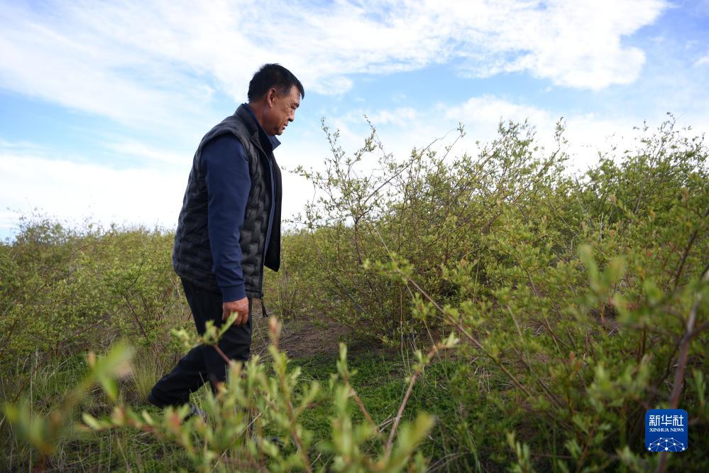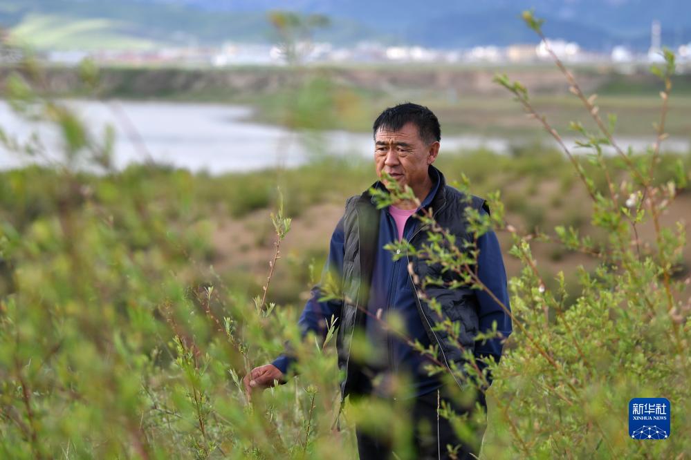 多年投身沙化草原治理的牧民卓玛加布在黄河玛曲段干流沿岸一处沙化草原治理点查看他参与种植的植被生长情况(7月5日摄)。