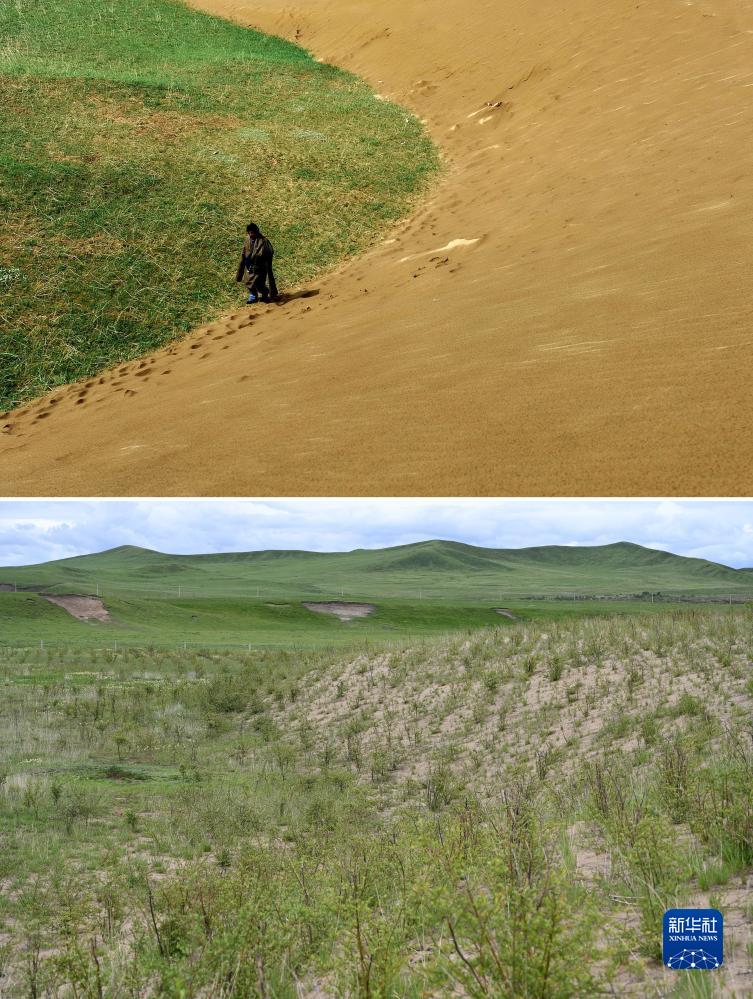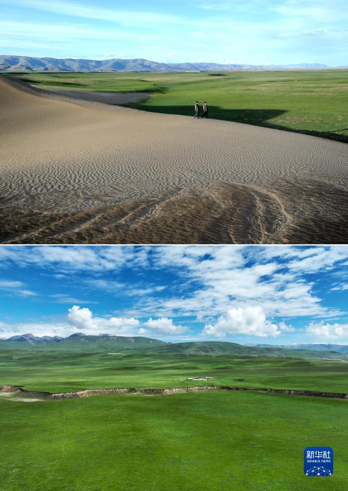 拼版照片:上图为2011年6月9日,甘南藏族自治州玛曲县欧拉乡欧强村村民豆格甲走在被沙丘侵入的草场上(新华社记者聂建江 摄);下图为2023年7月6日在甘南藏族自治州玛曲县欧拉镇欧强村拍摄的一处完成沙化治理的草场(新华社记者陈斌摄)。